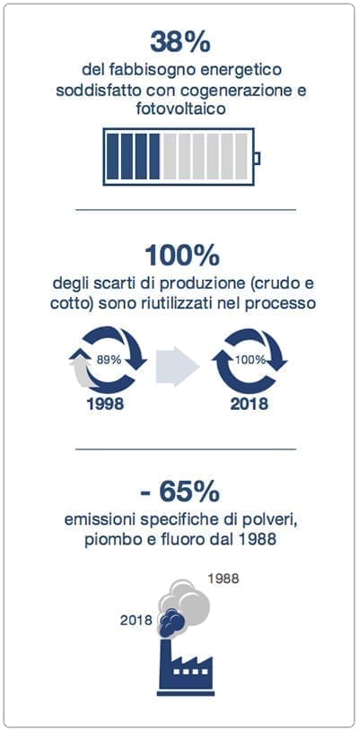 Circa il 90% delle emissioni di Pb e F viene abbattuto dagli impianti di depurazione, mentre per le polveri si arriva al 99%. Dal 1988, le emissioni specifiche di polveri, piombo e fluoro dagli impianti produttivi sono diminuite di circa il 65%. Le emissioni di anidride carbonica si concentrano nell’intervallo tra 3 e 8 kg/m2, con differenze date dal ciclo di lavorazione e dalla tipologia di prodotto realizzato. Il settore aderisce all’ETS (Emissions Trading Scheme) dell’Unione Europea, che istituisce a livello comunitario un sistema per lo scambio di quote di emissione di CO2 (EU Allowances) ed è pertanto impegnato nello sforzo per il raggiungimento degli obiettivi europei di riduzione delle emissioni con target -21% 2020 e -43% 2030.