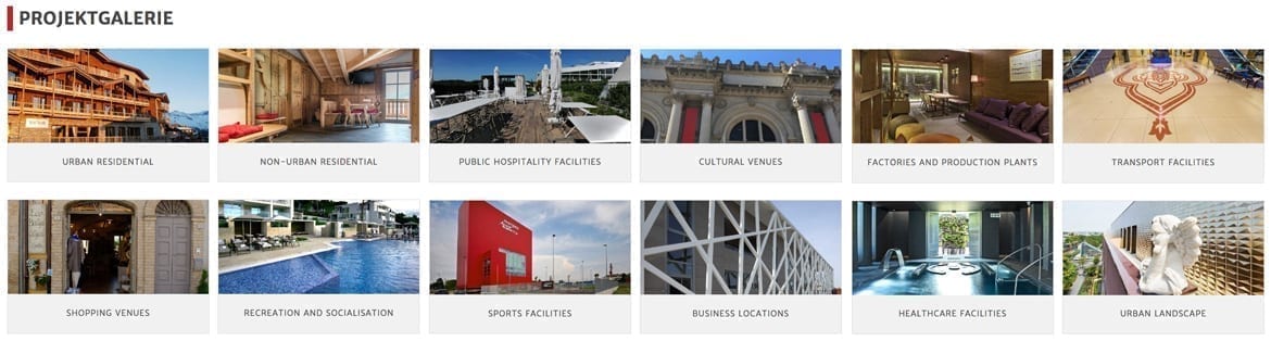Die Galerie zeigt die Projekte, die nach 12 verschiedenen Nutzungszielen organisiert sind – städtisches Wohnen, vorstädtisches Wohnen, Einkaufsorte, Erholung und Geselligkeit, öffentliche Räume der Beherbergung, Kulturräume, Sportgebäude, Geschäftsräume, Fabriken und Betriebe, Transportorte, Gesundheitsräume und städtische Einrichtungen-, was es erlaubt, eine reichhaltige Fotogalerie innerhalb jedes einzelnen Nutzungsziels zu erstellen. Wenn man auf das Referenzbild jeder Kategorie klickt, kann man die verschiedenen darin enthaltenen Projekte ansehen und dann jedes einzelne Unternehmensprojekt mit einem eigenen beschreibenden Text öffnen, der den Titel des Werkes, den journalistischen Autor, den Designer, die Marke der verwendeten Keramiken und die technischen Spezifikationen der Produkte anzeigt.