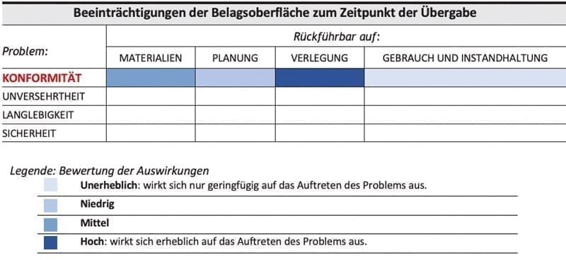 Nach dem Abschluss von Verlegearbeiten für einen Keramikbelag und noch bevor dieser vom Endkunden genutzt wird, sind auf der verfliesten Fläche gelegentlich Beeinträchtigungen des Erscheinungsbilds festzustellen, die vor der Verlegung nicht vorhanden waren und zum Zeitpunkt der Übergabe oder Abnahme des Keramikbelags auftreten können. Bevor der Keramikbelag dem Kunden übergeben und von diesem genutzt wird, muss daher seine Konformität oder Nichtkonformität mit den Anforderungen der Normen festgestellt und die Problematik bewertet werden.