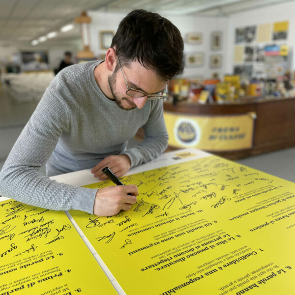 En cette année du quatre-vingtième anniversaire de Fila Solutions, les deux DG Francesco et Alessandra Pettenon, ainsi que la présidente Rosy Russo, ont signé le Manifeste en présence de tous les employés du siège italien, lors d’un événement corporatif et de formation interne, dans le hall du musée de l’entreprise. Première entreprise du secteur à défendre un sujet aussi important – qui touche au concept de soins personnels et surtout de sentiments de chacun, en se concentrant sur les mots, base de toutes les interactions humaines – FILA rejoint une communauté en ligne contre la violence des mots.