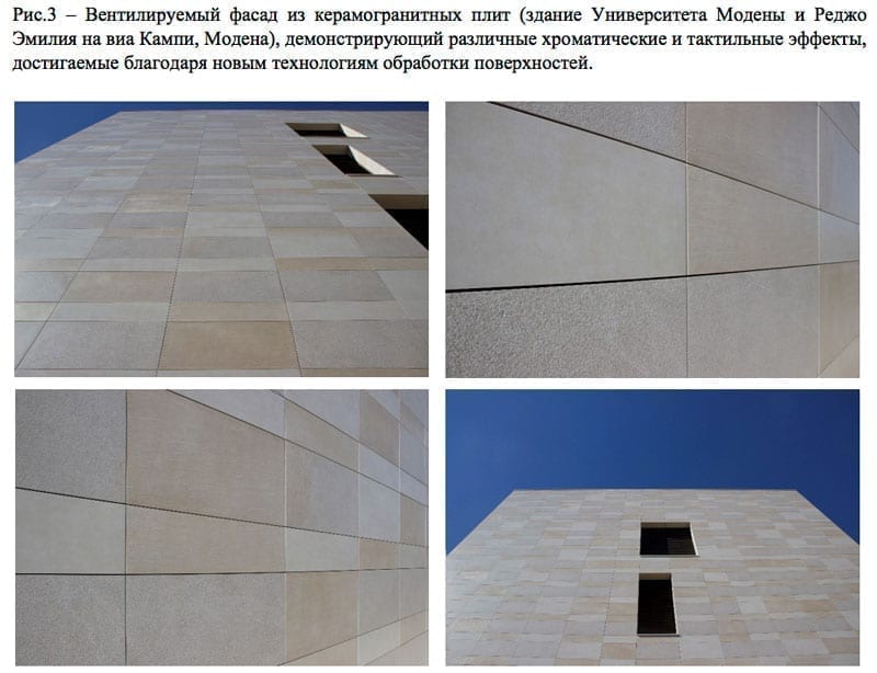 Среди разнообразных материалов для обшивки фундаментальную роль играет керамический гранит, предлагающий гибкие и элегантные решения с точки зрения композиции и эксплуатационных характеристик (Рис.2). Выбор этого материала, помимо его высоких эстетических качеств, объясняется его прочностью в отношении многих стрессовых условий, которым подвергается поверхность наружной обшивки: от механических ударов до перепадов температур, от воздействия химических агрессивных агентов до атмосферных осадков и загрязнения. Керамические плиты могут быть использованы также в зданиях большой высоты и, благодаря высокоточной цифровой печати и трехмерным эффектам, достигаемым с помощью новой технологии обработки, поверхности могут «превращаться» в любой тип материала, например, камень, мрамор, металл или дерево, воспроизводя хроматические нюансы, в том числе на тактильном уровне (Рис.3). Таким образом керамический гранит становится идеальным материалом для придания строительной однородности любому типу здания, что способствует его прекрасной адаптации к уже существующему контексту.