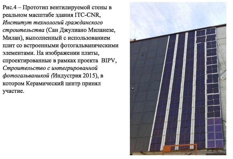 Помимо уже названных технических качеств, свойственных керамической плитке, можно получить в керамограните новые функции, которые повышают его добавленную стоимость благодаря его инновационности и экоустойчивости. Поверхностная функциональность позволяет расширить поле возможностей для систем облицовки, превращая плиты в активные элементы для улучшения энергетической эффективности здания: в качестве примера можно назвать фотогальваническую функцию, получаемую в результате включения фотогальванических элементов в керамическую плитку (Рис.4) и регулирование светоотражения с целью повышения показателя SRI (Solar Reflectance Index) на поверхности для смягчения эффекта «остров тепла».