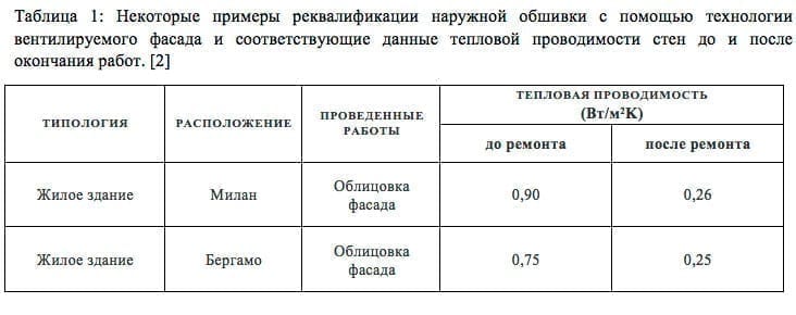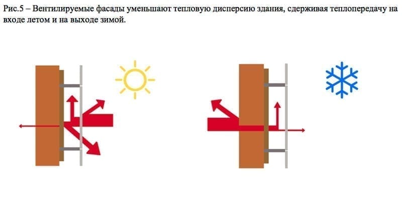 Несмотря на то, что энергетическая реквалификация обшивки больше продиктована требованиями законодательства, а не осознанием ее преимуществ для окружающей среды и общества в целом, она прямым и существенным образом влияет на экономический аспект, предлагая собственникам значительные преимущества, оценить которые не совсем просто. Как показывают различные примеры, некоторые из них приведены в таблице 1, эксплуатационные характеристики вентилируемого фасада способствуют снижению тепловой дисперсии на выходе зимой и на входе летом (Рис.5), что выражается в экономии средств в квитанциях по оплате, в связи с меньшим потреблением энергии, необходимой для обогрева или охлаждения помещений. Когда в процесс оптимизации включаются помимо матовых стен также прозрачные поверхности и перекрытия, энергопотребление здания можно сократить на 70-80%. Реквалификация обшивки здания позволяет впоследствии создать эффективное и правильно рассчитанное оборудование с мощностью потребления значительно ниже в сравнении с прежней ситуацией. Кроме того, учитывая современную экономическую ситуацию и постоянный рост цен на отопление, дом с низким энергопотреблением является прибыльной инвестицией на долгий срок. Следует также подчеркнуть, что улучшение эстетического вида зданий в соответствии с современными вкусами приводит к повышению его привлекательности, как на рынке аренды жилья, так и для купли-продажи с повышением стоимости минимум на 10% по отношению к среднерыночным ценам. Таким образом, можно заключить, что, учитывая действующие льготы, благодаря которым любой ремонт становится еще более доступным, выбор в пользу вентилируемых фасадов отвечает двойной цели энергетической реквалификации и одновременному улучшению архитектурного качества здания, а также экономии средств.
