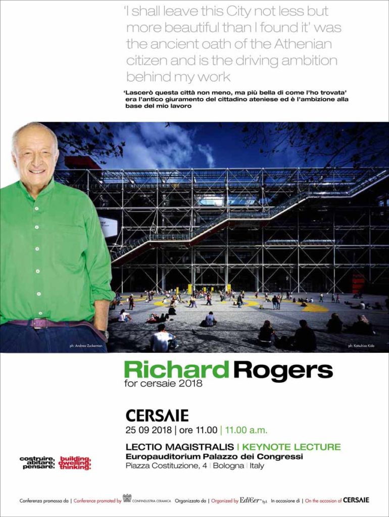 • Великая архитектура снова в центре внимания на выставке Cersaie. Британский архитектор и дизайнер, обладатель многочисленных наград, Лорд Ричард Роджерс, лауреат Прицкеровской премии 2007 года, проведет во вторник 25 сентября мастер-класс «Лекцио магистралис» во Дворце конгрессов в Выставочном квартале Болоньи. В водной части его представит историк архитектуры Франческо Даль Ко.