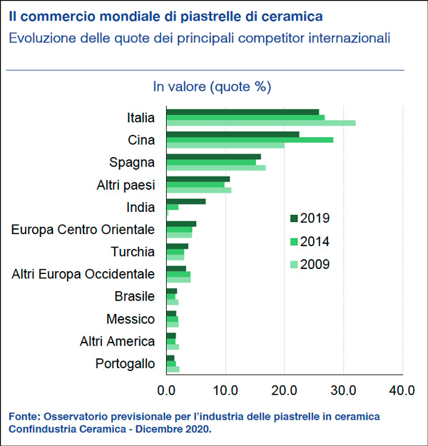 Tornando all’Italia le vendite complessive nel 2020 si sono attestate a 390,6 milioni di metri quadrati di superfici ceramiche, un dato in calo del 4% ma che è decisamente migliore del -16,8% registrato a maggio. E se la situazione è stata negativa, ma non da profondo rosso, è avvenuto grazie alla dinamica dell’export che è stata negativa dell’1,9% (contro una previsione a -14,1%) con una perdita di “soli” 6,2 milioni di metri quadrati di piastrelle, grazie alla dinamica del terzo e del quarto trimestre dell’anno che è riuscita a compensare le negatività del secondo (-19,6%). È il caso di osservare come sia stato proprio il mercato tedesco a “salvare” il 2020 della ceramica italiana; senza di esso l’export sarebbe calato il doppio di quanto poi realmente accaduto. Resta il fatto che l’Italia si porta a casa una quota del 12% del commercio mondiale saldamente in mano alla Cina (22,6%) ma ben presidiato da Spagna e India (15,7%) che continuano a fare meglio dell’Italia.