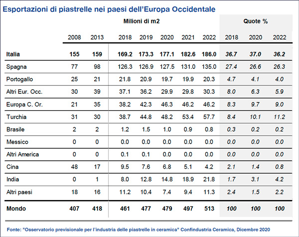 Il mercato della ceramica in Spagna ha scontato gli effetti della caduta a doppia cifra degli investimenti in edilizia residenziale. La caduta ha avuto un impatto negativo sui flussi dall’Italia ripiegati di oltre 0,5 milioni di metri quadrati nel 2020. Ma la ripresa prevista (Pil a +6,6% nel corso del 2021 e consumo di piastrelle a 151 milioni di mq, in crescita dell’8,6%) porterà l’Italia a fine 2022 a recuperare gli spazi persi nel 2020.