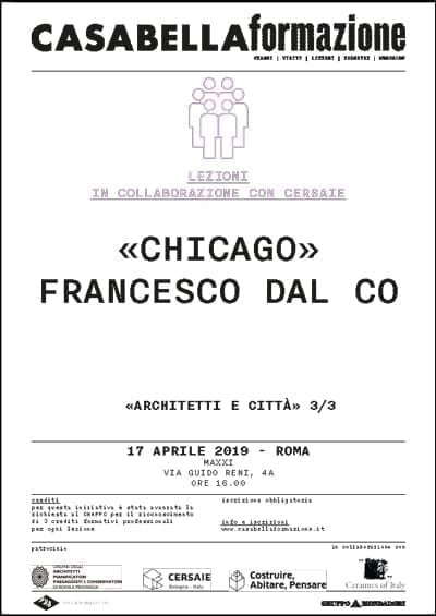 Dopo l’esordio a Firenze e il secondo appuntamento a Napoli, il terzo ed ultimo incontro si tiene il 17 aprile 2019 alle ore 16:00 presso il Museo MAXXI di Roma (Via Guido Reni, 4/A). Protagonista di questo incontro è il Professor Francesco Dal Co, che racconterà l’architettura della città di Chicago.