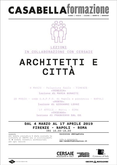 Confindustria Ceramica ed Edi.Cer., sotto l’egida dei marchi Ceramics of Italy e Cersaie, collaborano anche nel 2019 con CasabellaFormazione per l’organizzazione di un ciclo di lezioni e conferenze di architettura dal titolo “Architetti e Città”.