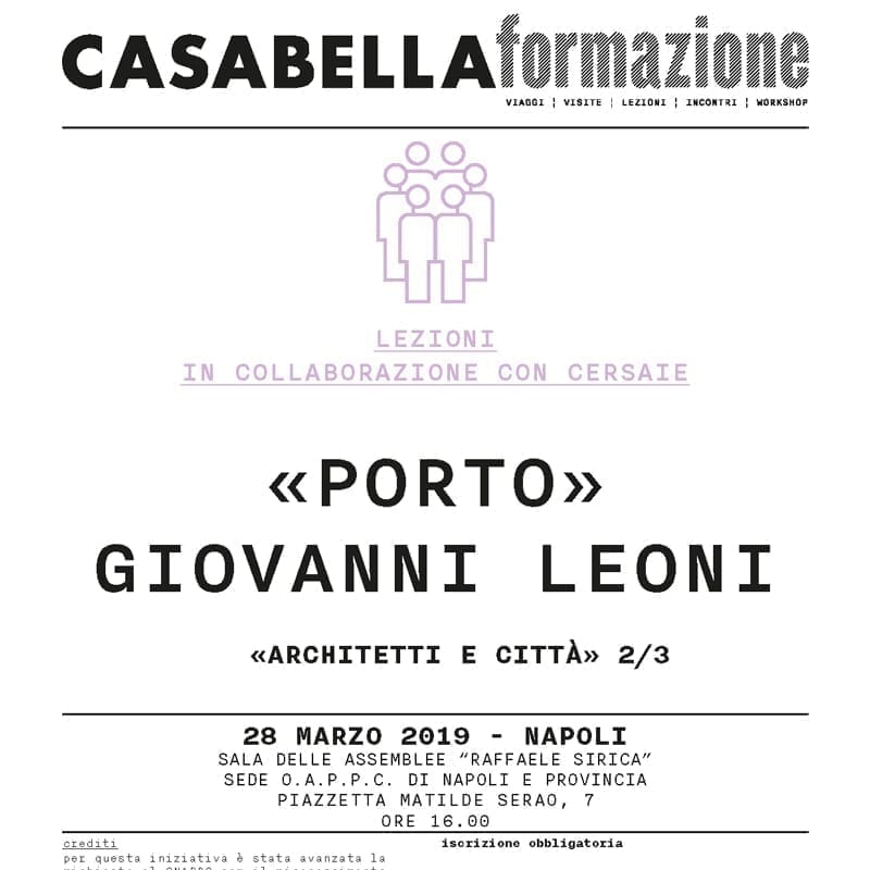 Dopo l’esordio a Firenze, il secondo appuntamento è il 28 marzo 2019 alle ore 16:00 presso la sede dell’Ordine degli Architetti di Napoli e provincia, con la presenza del Professor Giovanni Leoni che terrà la sua lezione sulla città di Porto, della quale illustrerà il ricco patrimonio architettonico.