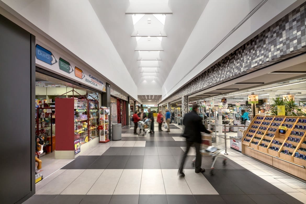 AS: Per quanto riguarda il retail è interessante il restyling di Unicoop di Castelfiorentino (2015), un intervento leggero e sostanziale dove la facciata si trasforma grazie alla sovrapposizione di una seconda pelle sull’involucro esistente. La galleria interna è modulata dalla luce naturale, sfruttando i due lucernari esistenti, integrandoli ad un sistema di velette in cartongesso utili a gestire e a intensificare l’illuminazione diffusa durante tutto l’arco della giornata e le teste muro delle vetrine dell’ipermercato sono arricchite da un rivestimento ceramico di diversi grigi che è diventato ormai un format dei fronti cassa di Unicoop Firenze. Infatti Castelfiorentino è parte di Relooking, il grande progetto di rinnovamento di molti centri commerciali di Unicoop Firenze.
