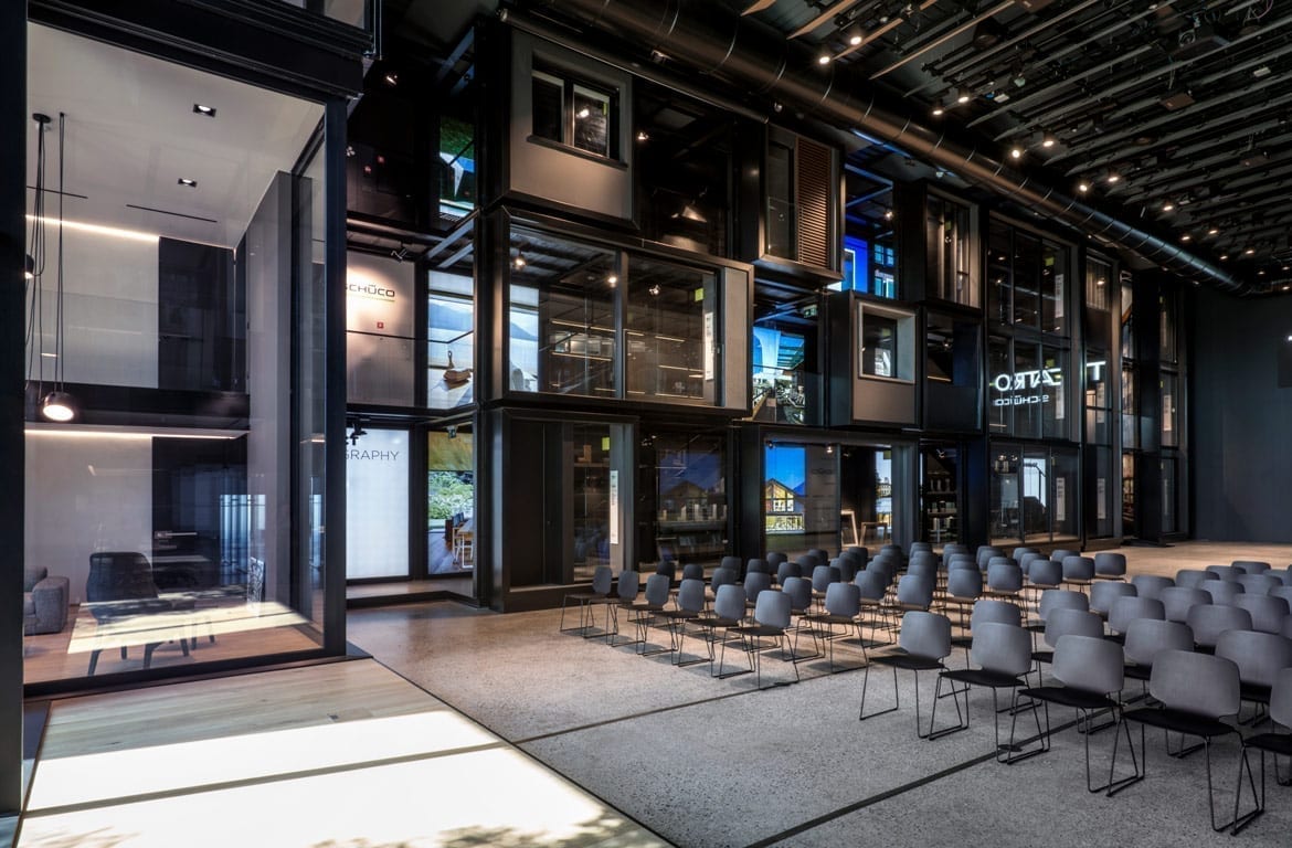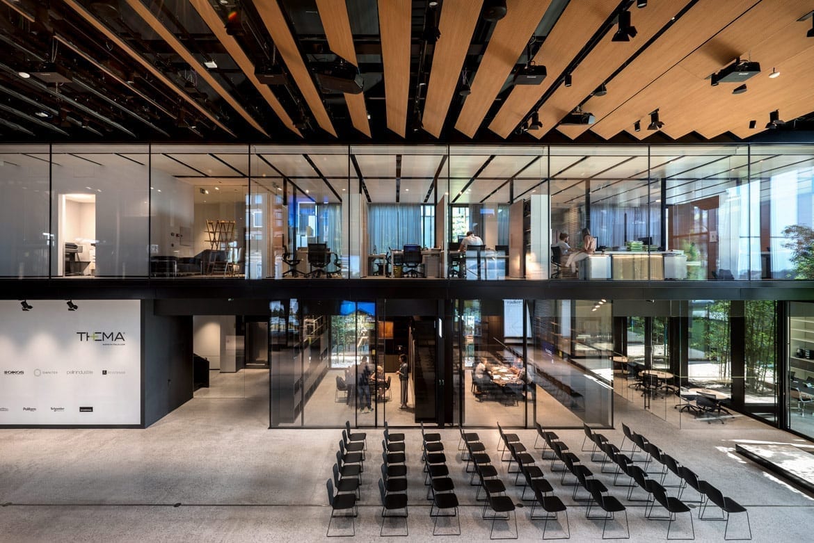 Con il progetto di Theatro, uno spazio espositivo realizzato nel 2017 a Verano Brianza (MB), volevamo invece creare per il cliente un’architettura che fosse nello stesso tempo uno strumento di comunicazione e di marketing. E’ nato da un’intuizione di Thema e Schüco Italia, che hanno percepito la necessità – e l’opportunità – di presentare le loro soluzioni in modo rivoluzionario rispetto al mercato con un palco, una platea, una scenografia, il foyer.