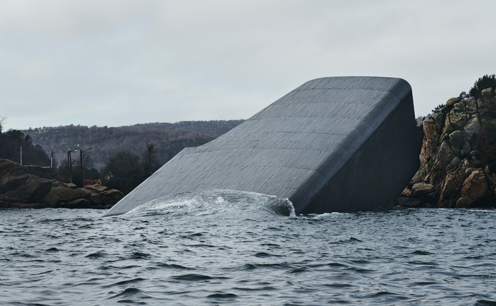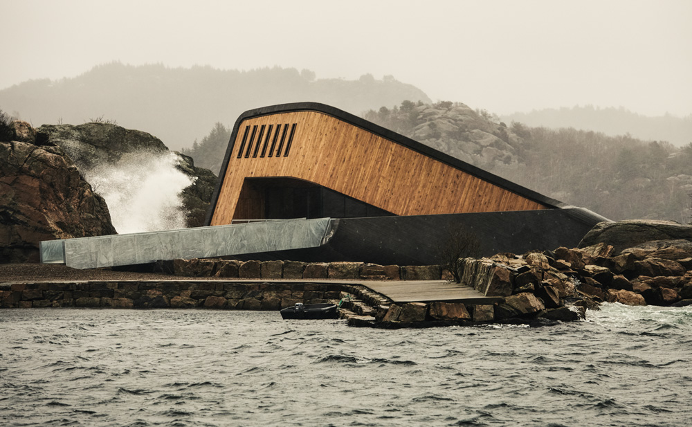 “Under significa ‘sotto’, ma in norvegese vuol dire anche ‘meraviglia’: abbiamo lavorato molto per creare un oggetto, un edificio, che in qualche modo fosse il più spettacolare possibile. È un ristorante semi-sommerso con vista sottomarina, che si trova nel sud della Norvegia. Racchiuso in un guscio di cemento di 34 m, Under è collocato sulla riva e inclinato affinché per cinque metri rimanga al di sotto della superficie dell’acqua, appoggiandosi al fondale marino. È situato nel punto più a sud della costa norvegese, dove l’abbondanza di biodiversita rende il ristorante anche un centro di ricerca per la flora e fauna marina. Il nostro cliente ci ha chiesto se fossimo interessati a fare questo ristorante subacqueo, che lui immaginava direttamente di fronte al suo albergo. Dopo la visita abbiamo però deciso di realizzare il progetto in un altro sito, sempre di sua proprietà ma un po’ più distaccato rispetto all’albergo. Il progetto ha un carattere molto monolitico, alcune persone l’hanno paragonato ad una balena, dato il colore. La matericità poi in qualche modo riprende materiali, colori e texture che fanno parte del contesto della costa norvegese. Questo grande guscio esterno, abbastanza duro e monocromatico, in realtà è in contrasto con gli interni, dove i materiali sono molto più morbidi; vi è un uso massiccio del legno, con forme molto più organiche. Dalla grande finestra di 11 x 3.4 metri si possono osservare tantissime specie marine, una grandissima quantità di alghe, ma anche meduse e pesci, dai colori che non ci si aspetta di vedere in Norvegia. Tutti questi colori e queste forme ci hanno influenzato nell’elaborare una palette, utilizzata non solo per curare l’architettura degli interni del ristorante, ma anche le sedie, addirittura le posate, e soprattutto la parte di brand identity, quindi ad esempio il sito internet, il menu. È stato un progetto totale, che ha riassunto tutta la nostra creatività”.