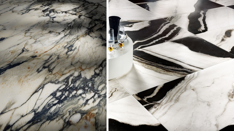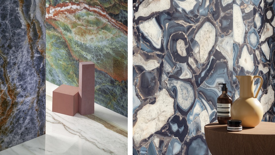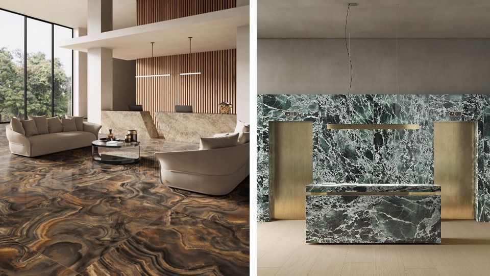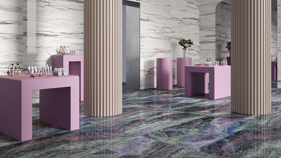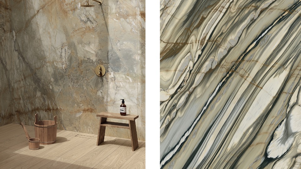 Per quanto riguarda le cromie, i marmi ceramici presentano venature decise verde e ruggine, passando dalla combinazione dei grigi, gialli dorati, viola, arancio-aragosta e marroni bruciati delle pietre semi-preziose rare dall’effetto-wow come onici, quarziti per un’idea di lusso naturale fatto di eleganza e raffinatezza.