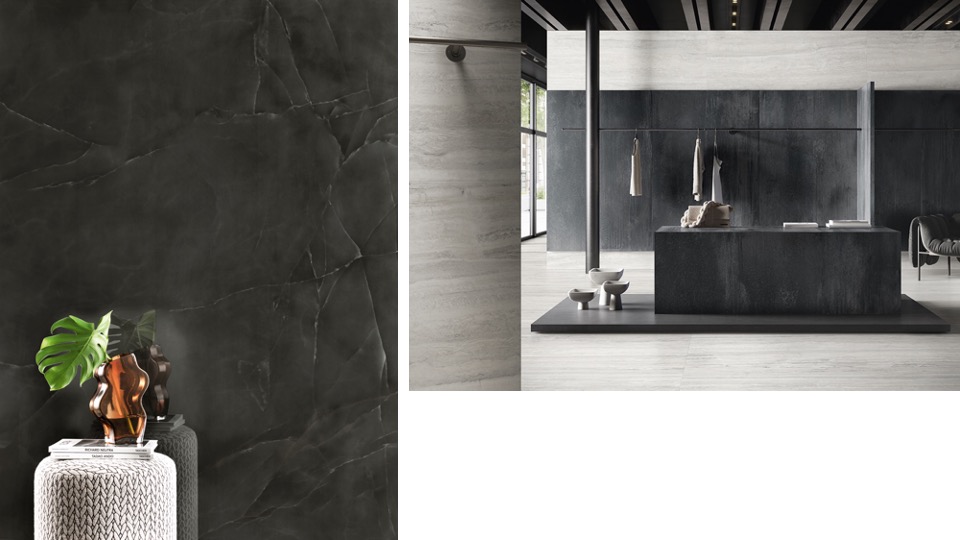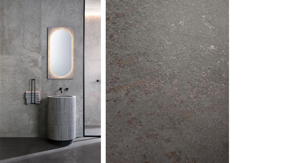 – grande rilancio anche dell’onice ceramico, fonte di leggerezza, profondità, dai colori luminosi e dalle sfumature impalpabili, così come delle pietre ceramiche dagli effetti più decisi, che ricordano la lava, il magma solidificato se non addirittura il metallo. Non mancano infatti le texture ricche di inclusioni: grani di diversa dimensione a volte in contrasto con i toni di fondo con effetti metallici e arrugginiti.