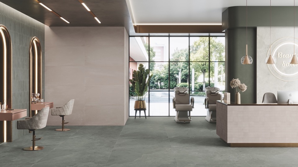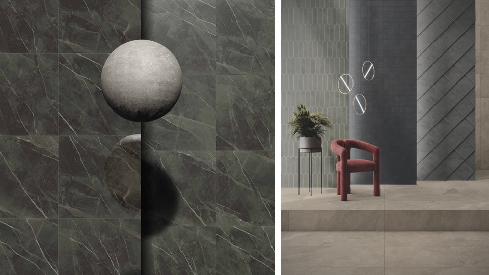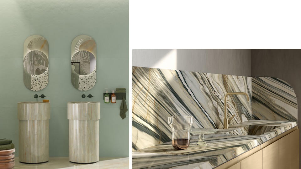 Nelle lastre ceramiche a effetto marmo e pietre preziose, il verde la fa da padrone, dal menta al salvia, fino ai toni più decisi delle foreste e degli elementi vegetali, che nelle decorazioni creano effetti luminosi lucido-opaco dei motivi botanici che si uniscono al cemento spatolato creando contrasti materici.