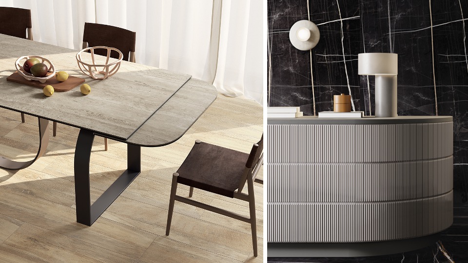 E per finire la “mission impossible” della ceramica italiana, troviamo anche gli elementi d’arredo, come le lastre che possono creare tavoli allungabili, i listelli che rivestono superfici curve, per creare lavabi integrati a colonna e a doppia vasca, rivestire forme cilindriche, creare top di da 12 a 20 mm in cui la venatura del piano continua, senza soluzione di continuità anche sul bordo.