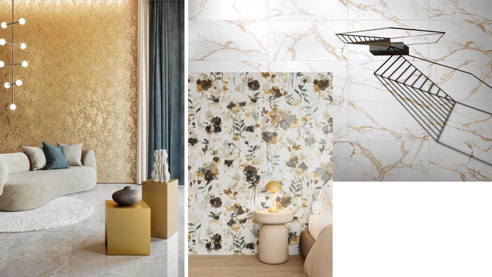 Oro a tutto campo sulla “ceramica da parati” ultrasottile simile ad un prezioso tessuto damascato o broccato, risulta morbido al tatto con decori preziosi per creare quinte di grande impatto e luminosità.