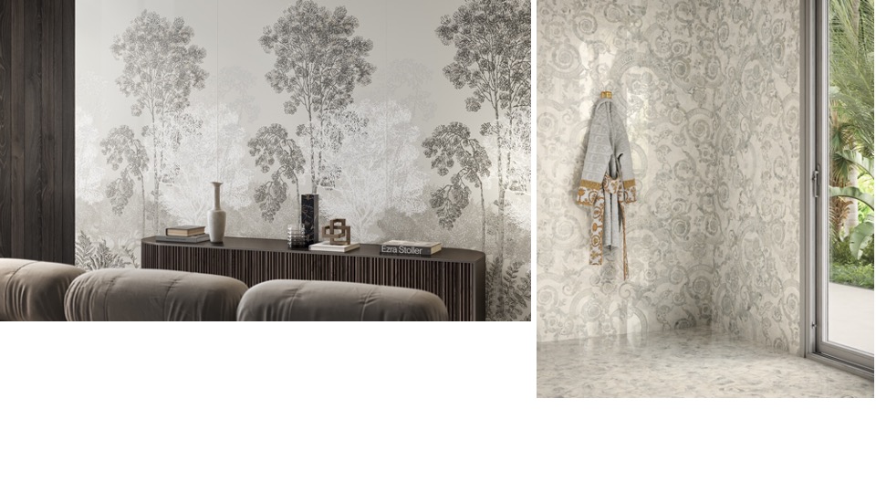 L’oro si insinua nelle raffinate boiserie ceramiche dai toni neutri di ispirazione naturalistica o si fonde all’interno della quarzite ceramica, pietra esclusiva di origine vulcanica nelle più delicate palette cromatiche e in cui i minerali preziosi intarsiati nel fondo si rivelano al tocco.
