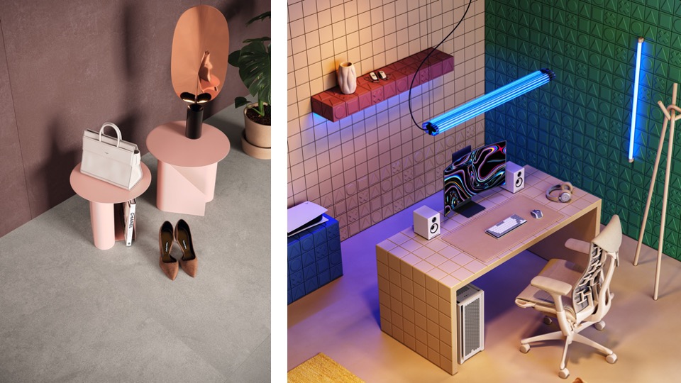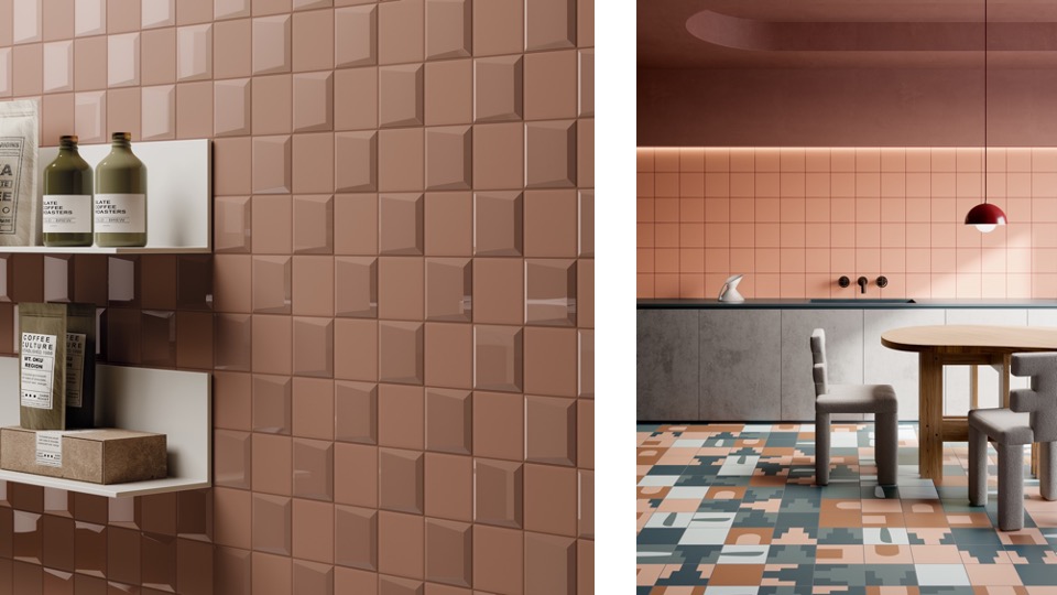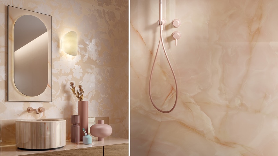 I rosa sono quelli setosi della cipria, trasparenti dei quarzi, morbidi dei cementi, che giocano con diverse finiture lucide e opache per creare pattern originali.