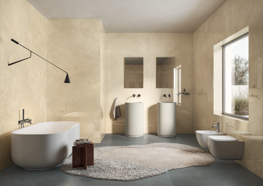 Il Limestone, morbido e delicato, si fonde con la brillante sobrietà del marmo Marfil per creare superfici dal realismo sorprendente. Le venature, sottili e profonde, sembrano affondare nella materia, suggerendo una bellezza stratificata e naturale. Il look finale risulta caldo, armonico, perfettamente bilanciato.