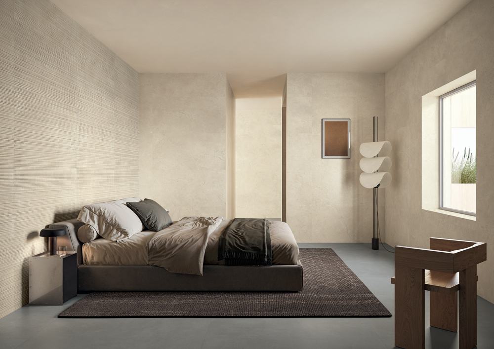 L’aspetto vellutato e irregolare della superficie ceramica Calcis restituisce l’essenza autentica delle rocce calcaree. Il sistema decorativo si articola in elementi tridimensionali e mosaici dalle linee raffinate, mentre le quattro varianti cromatiche – Crema, Avorio, Corda e Visone – richiamano le sfumature della terra, in un gioco visivo che esalta l’eleganza minerale della collezione.