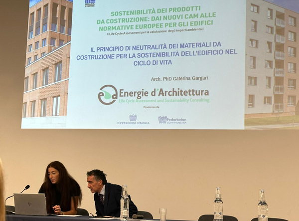 Alla sostenibilità dei prodotti da costruzione è stato dedicato anche il seminario formativo per professionisti “Sostenibilità dei prodotti da costruzione: dai nuovi CAM alle normative europee per gli edifici. Il Life Cycle Assessment per la valutazione degli impatti ambientali”, che si è svolto venerdì 20 ottobre nell’ambito di un ciclo di seminari promosso da Confindustria Ceramica, insieme a Federbeton, sul territorio nazionale.