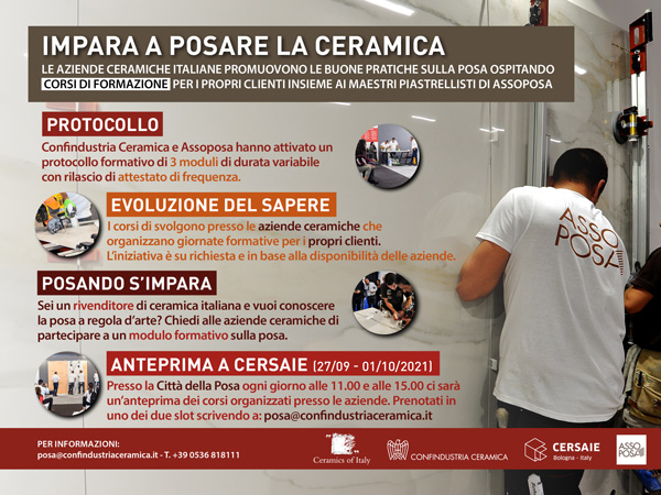 Uno spazio importante all’interno della ‘Città della Posa’ è occupato da Assoposa (Associazione nazionale imprese di posa e installatori di piastrellature ceramiche), che ogni giorno dialoga con gli operatori del mondo della posa e funge da Info Point per illustrare le attività fatte negli otto anni di vita dell’associazione e sugli obiettivi futuri di formazione e qualificazione professionale, tra cui le qualifiche di Piastrellisti, Maestri Piastrellisti e Lastrificatori XXL, i corsi triennali di istruzione e formazione professionale presso le scuole edili, l’apprendistato professionale con il sistema duale dell’alternanza scuola/lavoro.