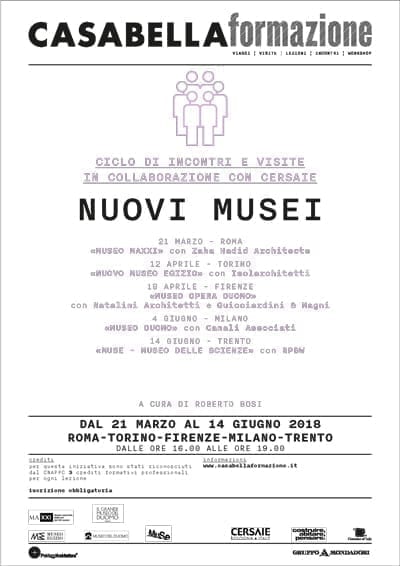 Per ciascuno di questi incontri sono stati riconosciuti 3 Crediti Formativi Professionali (2 per la conferenza, 1 per la visita) dal Consiglio Nazionale degli Architetti, previa iscrizione sul sito www.casabellaformazione.it