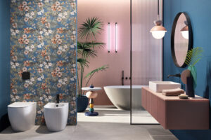 Allo stile jungle di assodato successo, si aggiunge una variazione sul tema e con richiami al passato: la ceramica caratterizzata da decori floreali. Comune denominatore, il desiderio di portare in casa un pezzetto di natura, per poter usufruire anche in spazi chiusi dei benefici effetti del contatto con il verde – anche se astratto. Ed ecco, quindi, che si moltiplicano le varianti di piastrelle con disegni – di grande o piccola dimensione – legati al tema floreale e vengono proposte in numerose varianti cromatiche.
