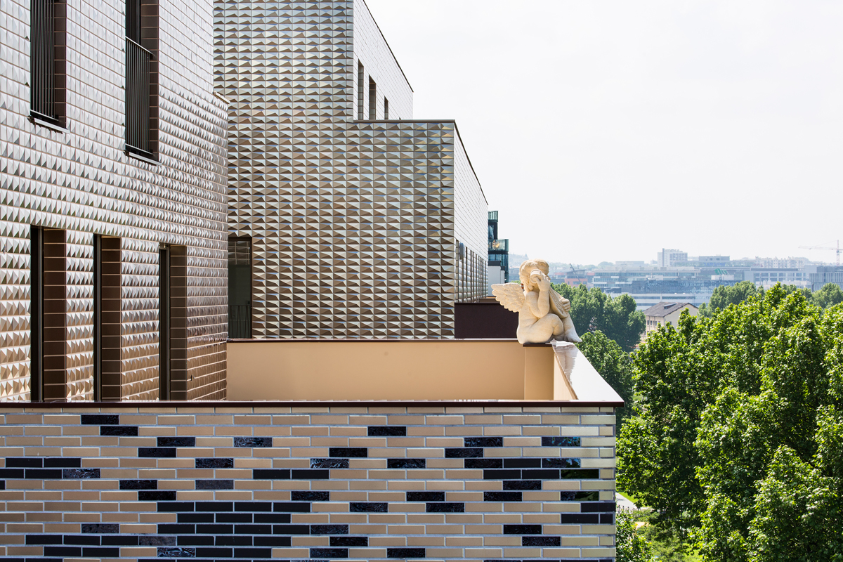 Ogni fronte definisce una sua specificità e racconta il progetto in modi differenti. Verso nord, la facciata di ingresso dal comparto principale si presenta con un rivestimento in ceramica color bronzo diamantata che riflette la luce e il cielo di Parigi. Verso ovest, un percorso aperto agli abitanti si muove attraverso gli alberi fronteggiando una facciata arricchita da balconi aggettanti protetti da una maglia verticale in legno. Il fronte opposto, a est aperto verso la collina verde, è caratterizzato da un fronte più compatto scavato a creare delle logge. L’accesso principale avviene verso sud a cui si accede alla hall di ingresso, un ampio spazio vetrato polifunzionale.