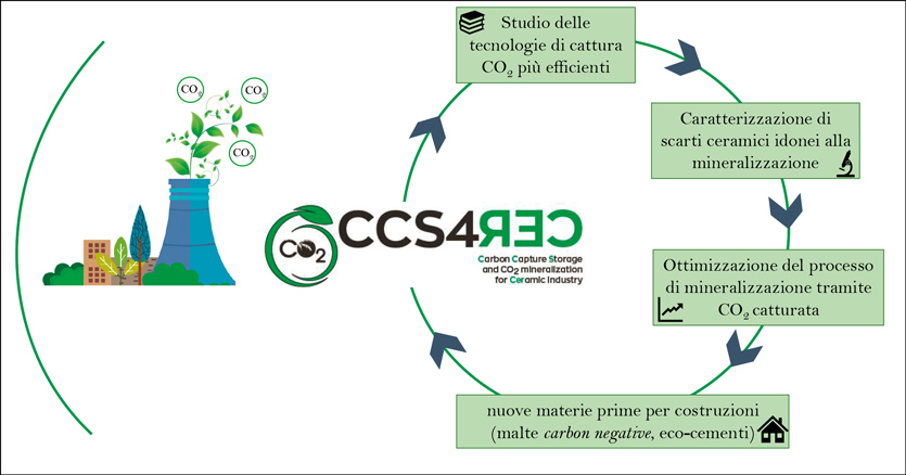 In questo contesto nasce il progetto CCS4CER: Carbon Capture storage and CO2 mineralization for Ceramic Industry, finanziato con i fondi Europei della Regione Emilia-Romagna, PR-FESR 2021/2027, Asse 1 Ricerca, Innovazione e Competitività, Azione 1.1.2. Il progetto si propone di trovare il miglior metodo per catturare la CO2 prodotta dagli impianti ceramici e tracciare una nuova strada per il riciclo di scarti ad oggi inutilizzati (es. calce esausta), attraverso processi di mineralizzazione.