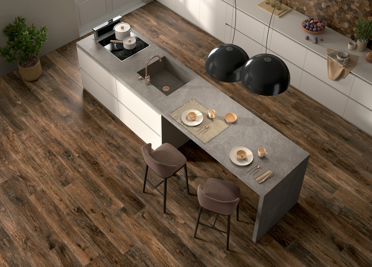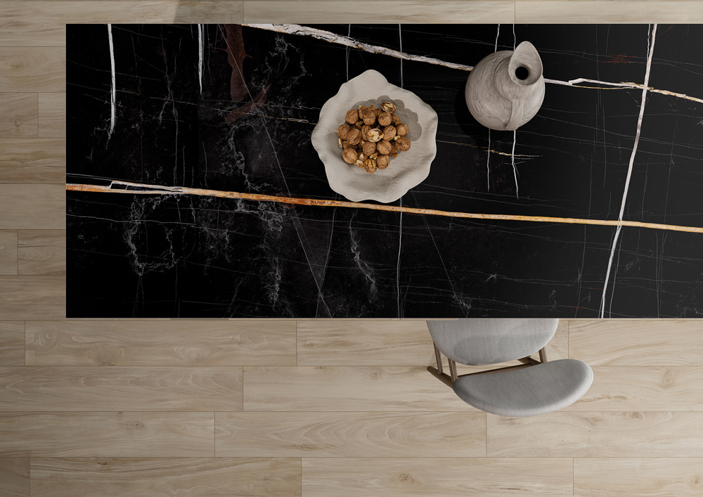 Anche il legno ceramico si combina con altri formati e con materiali diversi, crea nuove forme, si miscela talmente tanto da sembrare un fossile, secondo nuove geometrie d’effetto, sul macro e sul micro.