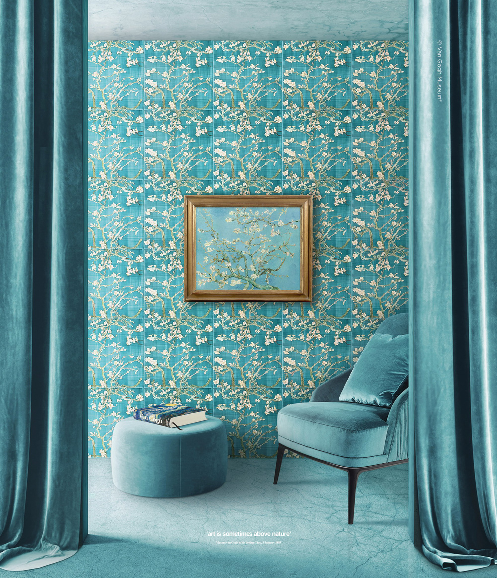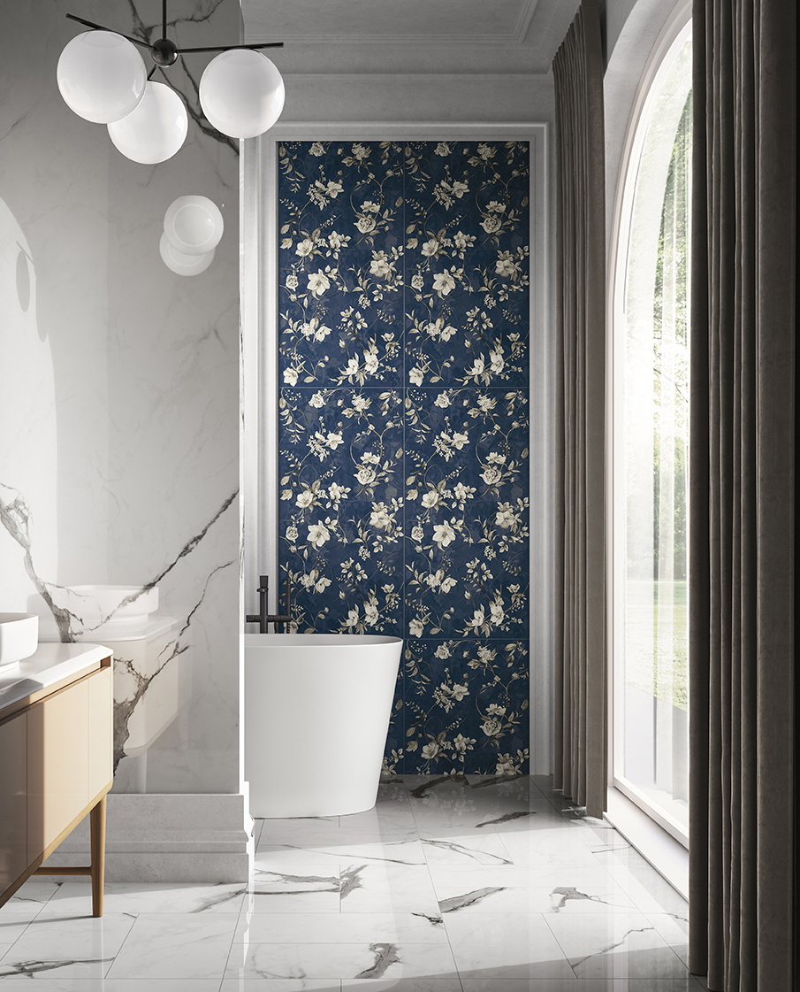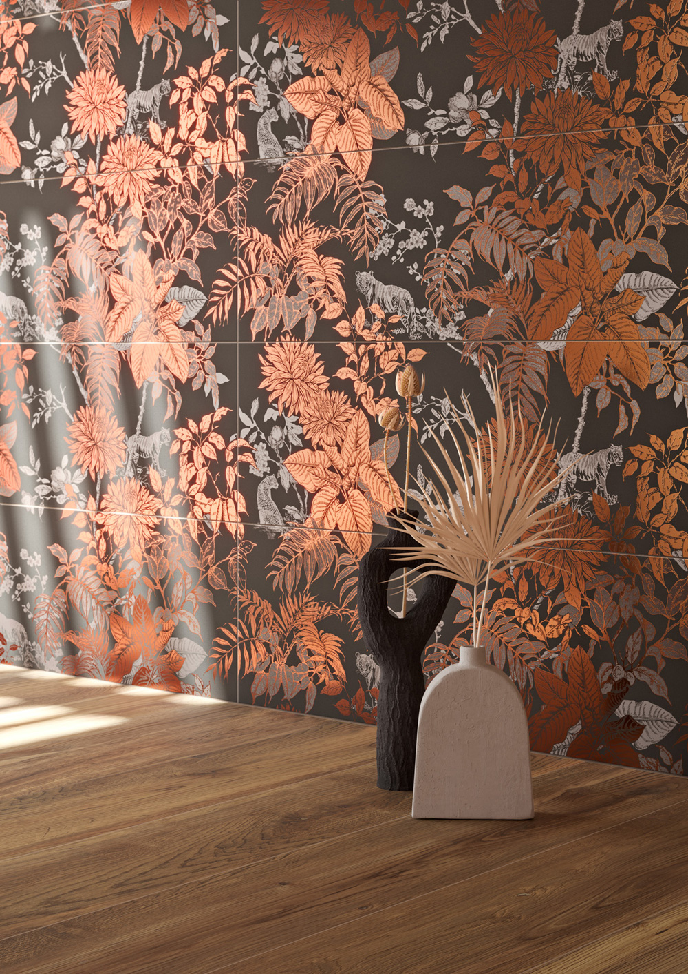 La ceramica dunque va ad arredare la casa come fosse un tappeto, un arazzo, una carta da parati. La natura floreale si esprime nella sua forma migliore sulle lastre a grafica unica in continuità raccordandosi in ogni lato, posate orizzontalmente o verticalmente, creando effetti all over, scale incluse, entra nelle camere da letto, a tutta parete o con soli accenni decorativi.