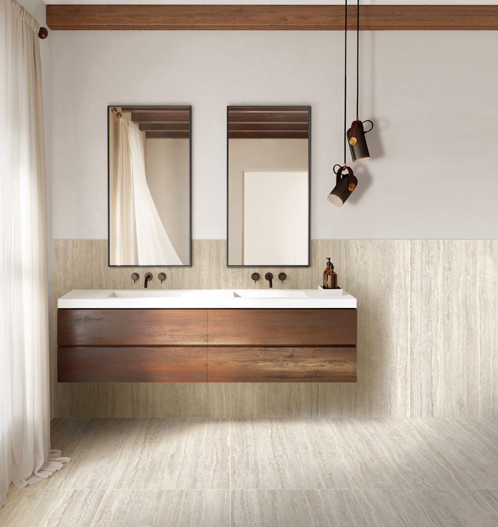 Nella sua versione integrale, il legno ceramico continua a confermarsi un must. La gamma si arricchisce a dismisura, le applicazioni sono sempre più ampie, l’effetto diventa sempre più sofisticato. L’ispirazione più attuale è quella delle radiche e dei mogani da barca, che ricorda anche lo stile scandinavo, utilizzato a pavimento, parete e quasi anche a soffitto. La finitura è lucida, quasi a specchio.