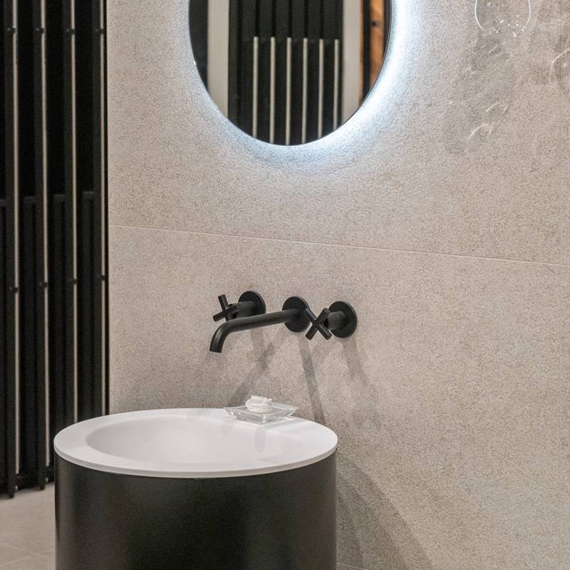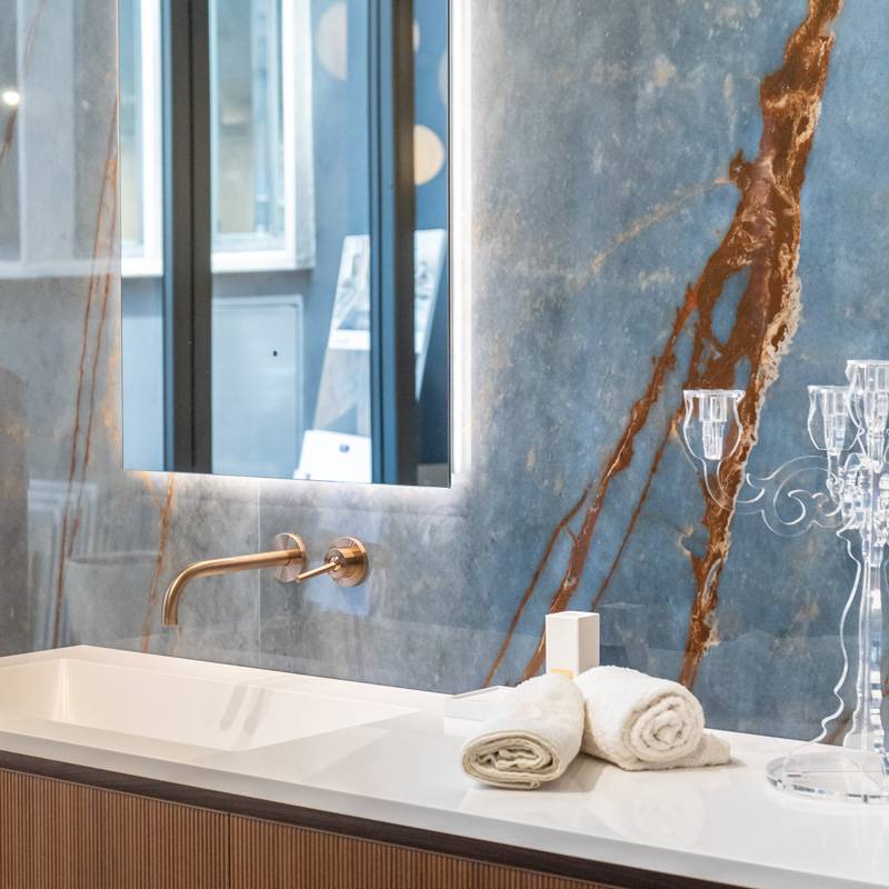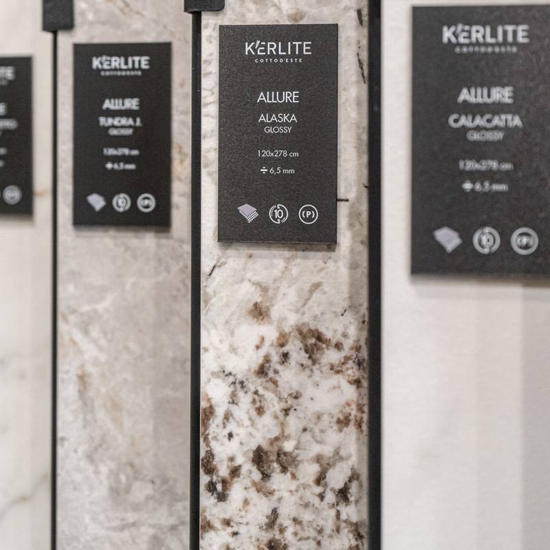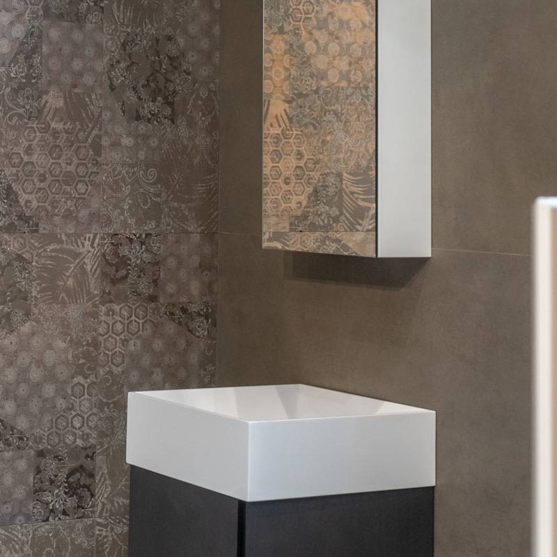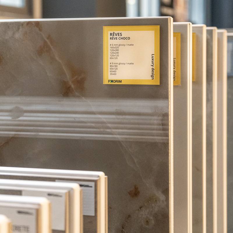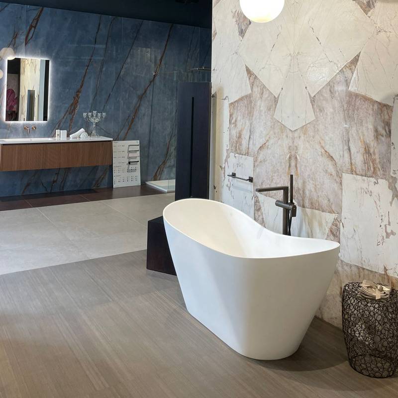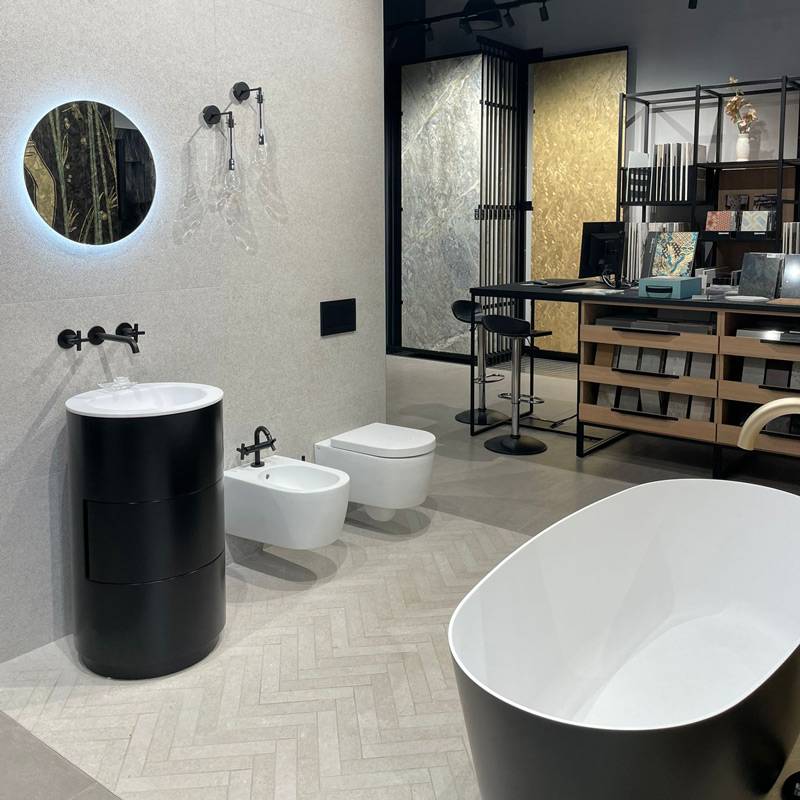 I grandi formati, sia su superfici lucide che opache. Fin dall’uscita sul mercato delle prime lastre in basso spessore, abbiamo subito investito su questa tipologia, rinnovando gli spazi e gli espositori; all’interno del nostro showroom sono esposte oltre 150 lastre in varie altezze, tipologie e finiture. Ogni box espositivo viene studiato e realizzato combinando varie ditte di parquet, sanitari, rubinetteria e box doccia, senza trascurare gli abbinamenti dei colori e delle finiture, ormai dettagli fondamentali per la realizzazione di un buon progetto. Oltre alle parti piastrellabili, stiamo cercando di sfruttare anche nuove superfici, e con l’ingresso delle resine e delle carte da parati, molto apprezzate in abbinamento alle ceramiche, abbiamo ampliato il raggio di azione, sia nella parte dedicata alla sala da bagno che alla zona living della casa.