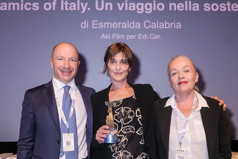 (Aprile 2024) Il documentario “Ceramics of Italy. Un viaggio nella sostenibilità” ha vinto le sezioni ‘Miglior film d’Impresa’ ed ‘Ente dello Spettacolo – Rivista del Cinematografo’ del Premio Film Impresa di Roma, giunto alla sua seconda edizione. Il docufilm è stato promosso da Confindustria Ceramica, prodotto da Edi.Cer. spa e realizzato grazie al sostegno del Ministero degli Affari Esteri e della Cooperazione Internazionale e di ITA (Italian Trade Agency).