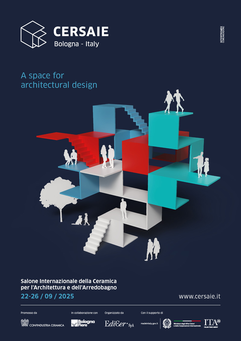 Il design architettonico permea gli spazi della vita quotidiana e ne influenza il modo di vivere, di lavorare, di viaggiare, venendone a sua volta condizionato. Il visual 2025, che rappresenta l’evoluzione del concept dell’ultima edizione di Cersaie, si caratterizza per una visione più ampia e tridimensionale: una vista multipolare su più piani e più prospettive, in grado di intercettare le esigenze presenti e future del vivere e dell’abitare quotidiano.