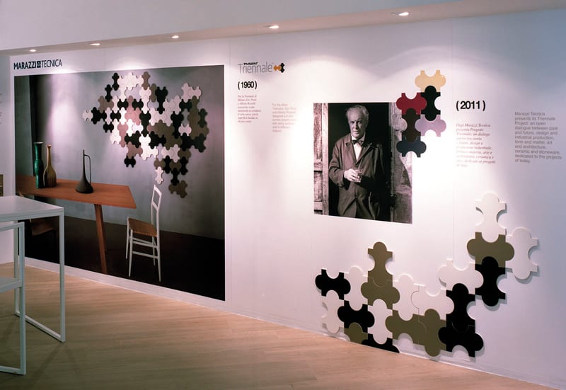 Su Gio Ponti e la ceramica potremmo parlare a lungo. Accennando ai suoi esordi come giovane direttore artistico della Richard Ginori nel 1923; passando dal ricordo di un Gio Ponti quarantenne, con baffetti e capello impomatato, fotografato con alle spalle la decorazione in piastrelle ceramiche di un famoso caffè; arrivando ai disegni a matita per le ceramiche dell’albergo capolavoro di Sorrento, che saranno realizzati nelle sfumature del blu che prenderà il suo nome. Ricordando che nello stesso anno (1960), Gio Ponti e il genero Alberto Rosselli daranno vita alla piastrella “Triennale” per Marazzi, con quattro linee curve, un classico ancora in produzione (fateci caso: lo vedrete spuntare anche in uno spot del Parmigiano Reggiano). C’è poi una frase nel libro-manifesto di Gio Ponti “Amate l’Architettura” (1957) che mi sembra opportuno richiamare, una considerazione breve ma illuminante che dice: “la ceramica denuncia di essere un rivestimento, ma dà alla superficie un valore plastico”. Quindi riesce a trasferire l’idea di una profondità, non per forza solo prospettica o geometrica, rompendo la bidimensionalità alla quale giocoforza è destinata.