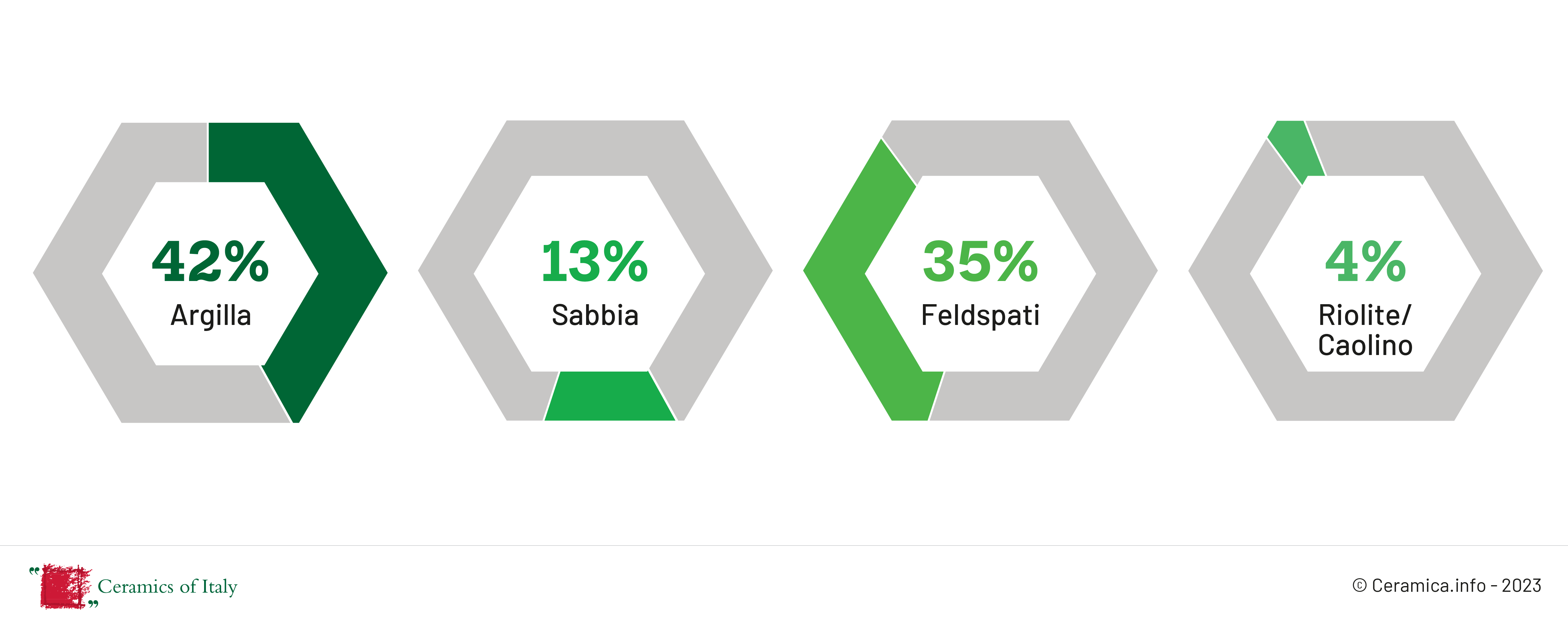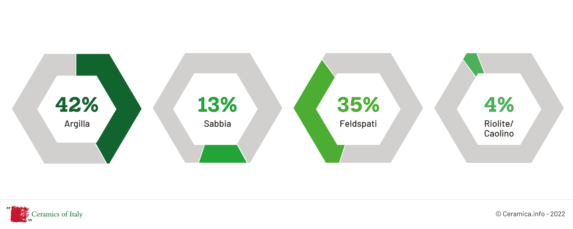La Ceramica Italiana nasce da materie prime naturali pressate a secco o lavorate attraverso processi di estrusione e, nel caso della ceramica sanitaria, per colaggio. Un prodotto ceramico medio, rappresentativo dell’intera produzione italiana, è costituito prevalentemente di terre pregiate e al suo interno contiene argilla, feldspato, sabbie, caolino e altri materiali minerali.