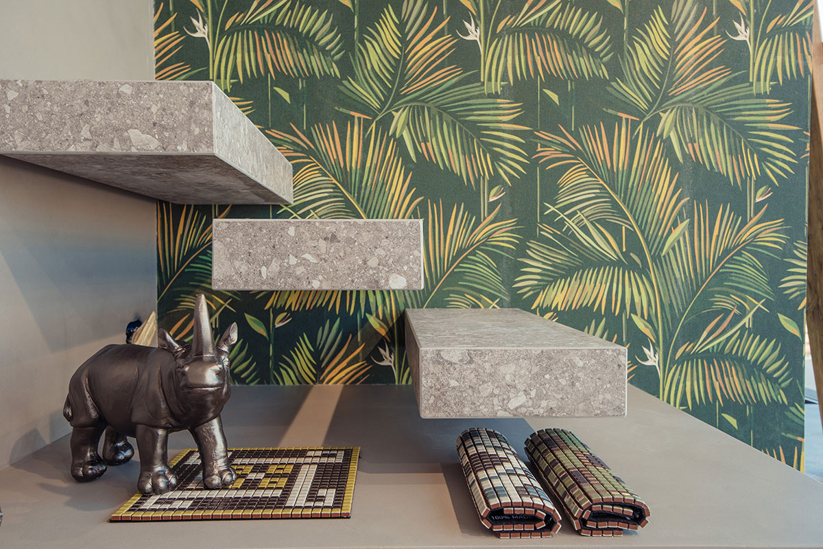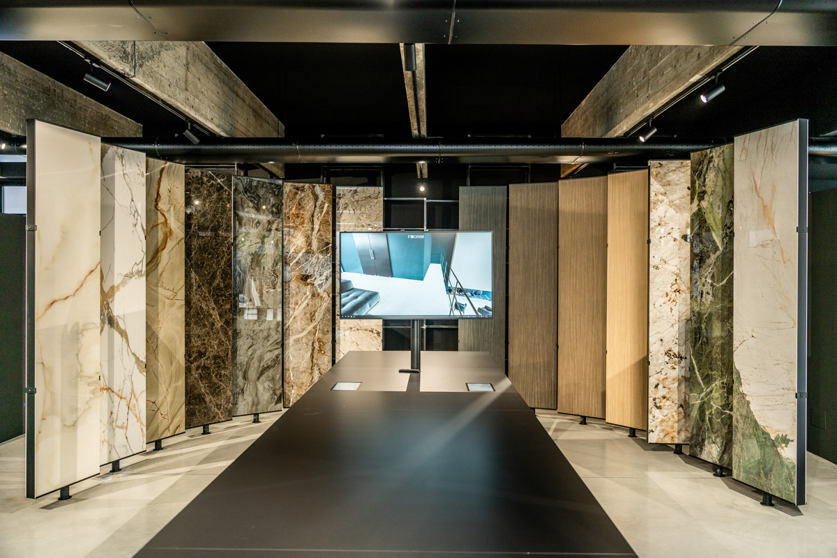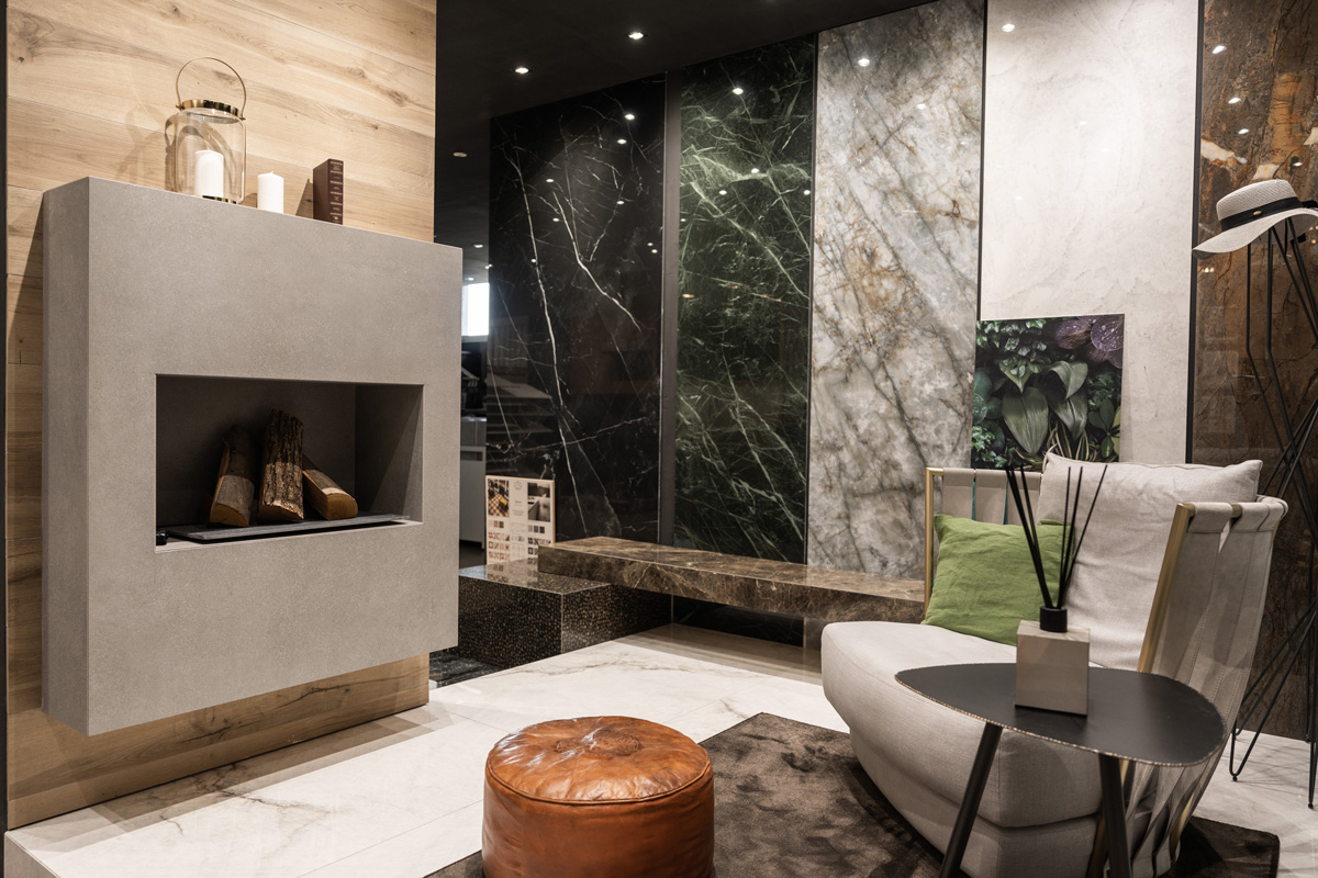 Al primo piano abbiamo uno spazio espositivo di oltre mille metri quadrati dedicato alle superfici e all’arredo bagno. Abbiamo creato tante ambientazioni diverse per far toccare con mano al cliente i materiali e soprattutto le diverse lavorazioni. Ogni ambientazione offre una soluzione diversificata, consentendoci di mostrare con trasparenza come lavoriamo. Questo non solo permette di giustificare il costo delle lavorazioni preventivate, ma costituisce una vera e propria garanzia di qualità, presentando ancora prima di arrivare in cantiere quali sono i nostri standard di posa. Al piano terra troviamo una nuova area espositiva che abbiamo aperto quest’anno, dedicata alle lavorazioni in gres porcellanato: una vasta arena centrale per l’esposizione dei grandi formati a tutta altezza, con un configuratore collegato a due maxischermi per visualizzare i materiali nelle ambientazioni prescelte. Oltre all’arena troviamo anche uno spazio dedicato alle cucine rivestite in gres porcellanato e all’arredo in gres realizzato dal nostro laboratorio interno, ImpronteLab. Entro la prossima estate inaugureremo anche l’esposizione outdoor, dove avremo una piscina, una cucina esterna in gres e un’area living completamente realizzata in gres porcellanato e decking.