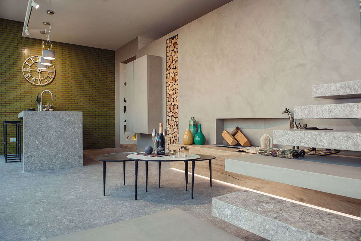 In generale, direi che negli ultimi anni abbiamo visto aumentare sempre più l’interesse verso i grandi formati, grazie anche alle ampie possibilità applicative delle lastre che possono essere declinate in arredi abbinati alle superfici, scale con gradino ad effetto monolitico, top cucina e molto altro. Nelle nostre consulenze cerchiamo sempre di inserire degli elementi personalizzati in base ai gusti e alle esigenze del cliente, per questo motivo le nostre realizzazioni sono molto varie e diventa difficile individuare un prodotto di punta. Cerchiamo di legare la forza della realizzazione al progetto più che al prodotto in sé, che come ben sappiamo, può trovare declinazioni estetiche simili nelle proposte di diverse aziende produttrici.