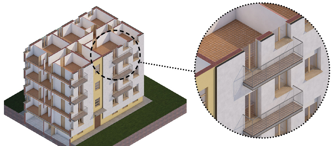 I modelli dei due edifici, realizzati mediante software Archicad***, sono stati arricchiti della parte informativa relativa sia ai materiali esistenti che a quelli di progetto. Mediante infatti la collaborazione con Centro Ceramico e le aziende partner di progetto, Tonalite S.p.A. e Ceramiche Refin S.p.A., sulla base sia di specifiche prestazionali che di criteri estetici, sono stati selezionati i prodotti “piastrelle di ceramica” più idonei allo specifico utilizzo. All’interno dell’edificio ottocentesco, al fine di garantire una corretta coesistenza con le pavimentazioni originali, sono state scelte piastrelle in bicottura esagonali riproducenti motivi già presenti nella pavimentazione esistente. Nell’edificio condominiale, alla piastrella 60x60cm in gres porcellanato è stata affidata la duplice funzione di finitura dell’isolamento termico e, grazie alle proprietà di riflessione solare, di riduzione della penetrazione dell’onda termica nelle strutture in regime estivo.