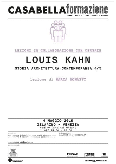 Confindustria Ceramica ed Edi.Cer., sotto l’egida dei marchi Ceramics of Italy e Cersaie, collaborano anche quest’anno con CasabellaFormazione per l’organizzazione di un ciclo di 5 lezioni e conferenze di architettura internazionale dal titolo “Storia dell’Architettura Contemporanea”, che toccano le città di Genova, Perugia, Siena, Venezia ed Ancona, da marzo a giugno 2018. Dopo le tappe di Genova, Perugia e Siena, il quarto appuntamento è in programma a Venezia venerdi 4 maggio 2018 alle ore 15:30, presso il Centro Cardinal Urbani di Zelarino (Via Visinoni, 4/C), con la lezione della Professoressa Maria Bonaiti sul famoso architetto statunitense Louis Kahn.