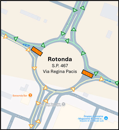 Sono apportate modifiche all’assetto viario che comportano variazioni temporanee alla viabilità della Rotonda S.P. 467–Via Regina Pacis