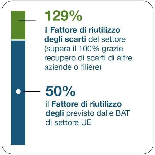 Queste attività di utilizzo dei residui di produzione generati in sito produttivo ceramico e all’esterno possono avvenire secondo diversi schemi organizzativi in base alla dotazione impiantistica presente nei siti e alla natura del materiale. A livello settoriale il fattore di riutilizzo medio degli scarti si attesta su un valore pari al 129%, ampiamente al di sopra del valore di 50% prescritto dalle BAT di settore (migliori tecniche disponibili identificate dalla UE).