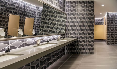 Siamo usciti dagli schemi anche quando si trattava di scegliere la ceramica per i bagni. Abbiamo scelto piastrelle da rivestimento inaspettate e audaci con motivi 3D sia per il bagno maschile che per quello femminile, ciascuno con la propria tonalità.