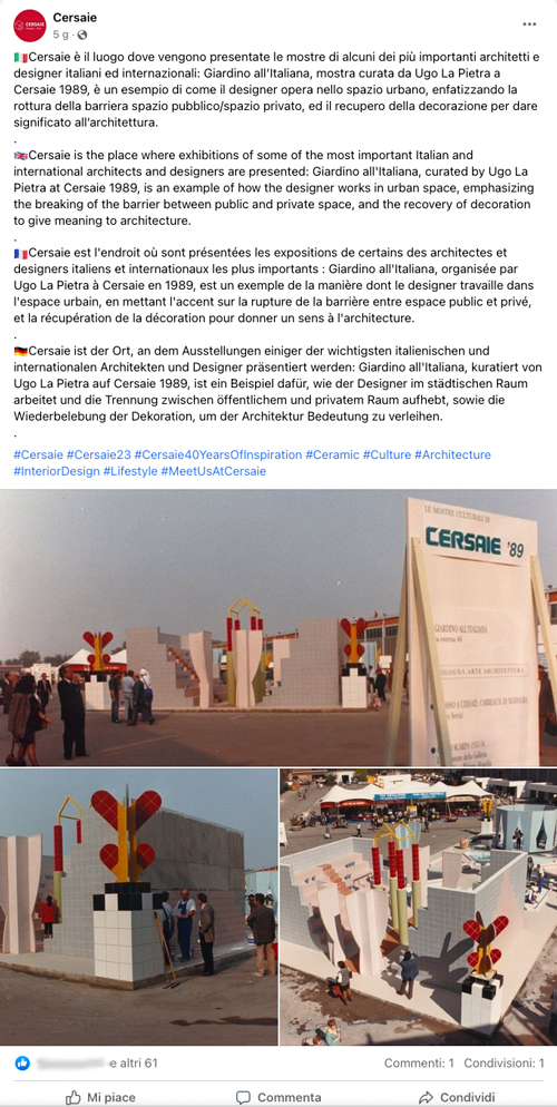 Il racconto di questo quasi mezzo secolo di storia del costume e delle tradizioni avverrà secondo due direttrici. La prima assume le forme di campagna sui canali social Linkedin, Instagram e Facebook di Cersaie dedicata a raccontare i prodotti che hanno marcato la differenza, i progetti più innovativi, gli eventi istituzionali ed aziendali di Cersaie maggiormente rappresentativi. L’approccio seguito, lungi dall’essere quello dell’‘amarcord’ dei bei tempi che furono, punta a descrivere – attraverso una modalità random – i momenti che hanno marcato una discontinuità con il passato, tali da fissare pietre miliari nell’evoluzioni del settore e da rimanere a tutt’oggi, a distanza di anni, materiali ed edifici di riferimento nel panorama del design e dell’architettura. Un esempio, tra i tanti. Il Bosco Verticale di Stefano Boeri costruito nel 2009, splendido esempio di sostenibilità urbana declinata con una nuova modalità, vede la presenza di lastre di gres porcellanato nere che, mentre ne descrivono la cifra architettonica, svolgono anche una importante funzione coibentante e di rivestimento della facciata.