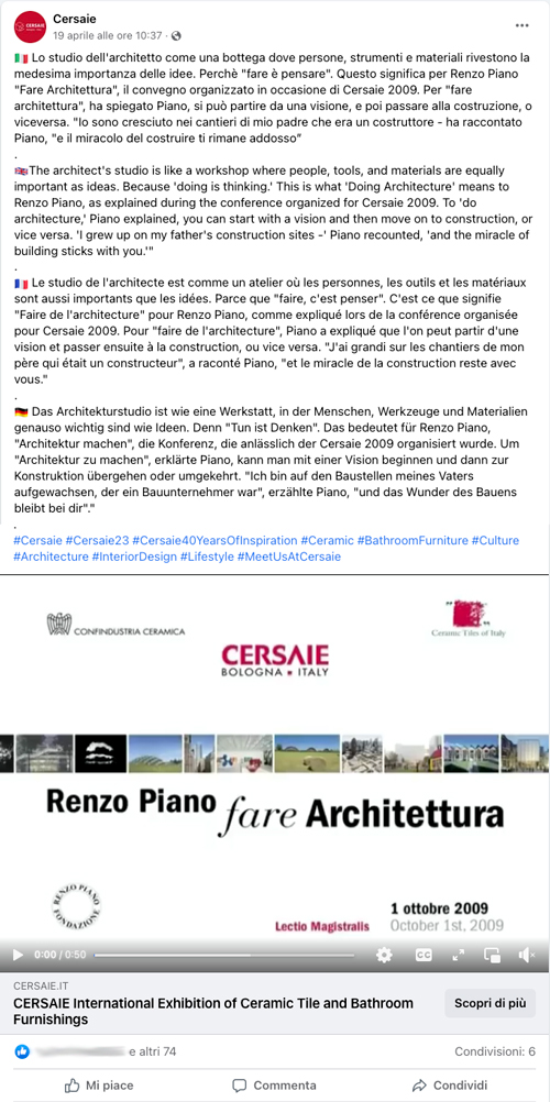 Una campagna sui social media di Cersaie per raccontare l’eccellenza di questa manifestazione, che a fine settembre celebrerà la sua 40° edizione, facendo leva su quattro aspetti fondamentali: l’essere l’appuntamento dove vengono presentate in anteprima mondiale le novità di prodotto per la ceramica e l’arredobagno; il vedere utilizzati alcuni di questi materiali in progetti di architettura iconici; l’avere la massima rappresentatività espositiva a livello mondiale per i settori coinvolti; l’essere una piattaforma culturale, formativa, informativa e relazionale per l’intera filiera.