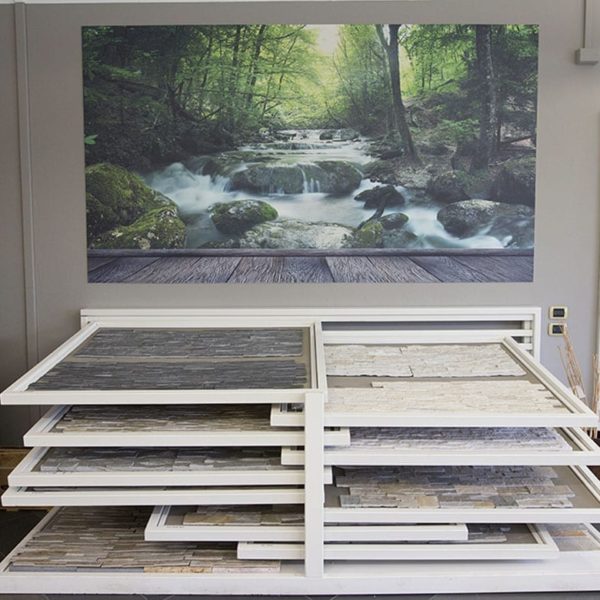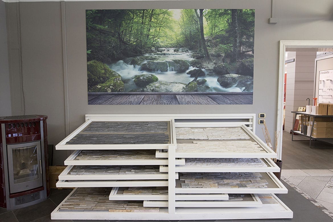 Siamo nati come azienda dedicata alla stanza da bagno, ma da lì ci siamo via via ampliati, rivolgendoci a tutti gli ambienti della casa e ai suoi diversi elementi. Proponiamo pavimenti e rivestimenti di ogni genere, dalle piastrelle al legno, dai laminati alle resine fino alle pietre per esterni, con anche una interessante sezione wallpaper. La parte del leone spetta alla ceramica (60%), un 20% spetta al legno e il restante 30% si divide tra gli altri materiali. Da alcuni anni, con l’evoluzione del gusto, accompagnato dagli straordinari progressi della tecnologia, la ceramica è uscita dal bagno verso tutte le stanze. Oggi, vanno moltissimo le maxi lastre a spessore minimo, senza fughe, con un effetto intonaco, adatte anche ai soggiorni dove possono fare la funzione di boiserie. E anche nel pubblico: scuole, bar, moltissime concessionarie auto, ospedali…. Abbiamo poi tutta la gamma dei sanitari e un settore wellness che diventa sempre più ampio; oggi la clientela privata, accanto agli idromassaggi, richiede saune, bagni turchi, mini piscine a costi contenuti e adatti anche a spazi minimi. Noi proponiamo questi articoli, spiegando e mostrando le fasi di lavorazione, per far comprendere concretamente come sia possibile inserirli negli spazi domestici.