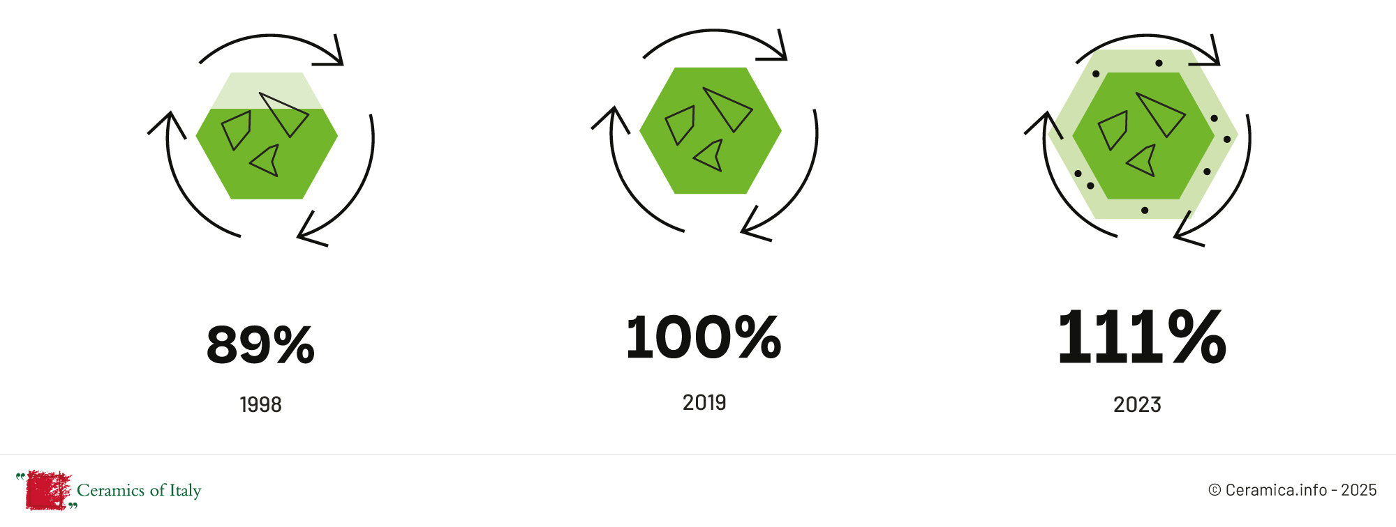 Dal 1998 al 2019 le industrie produttrici di piastrelle e lastre hanno risparmiato oltre 600.000 tonnellate di materie prime in meno ogni anno, come argille e feldspati. Nello stesso periodo, la percentuale di scarti di produzione riutilizzati, sia crudi che cotti, è passata dal’89 al 100%.